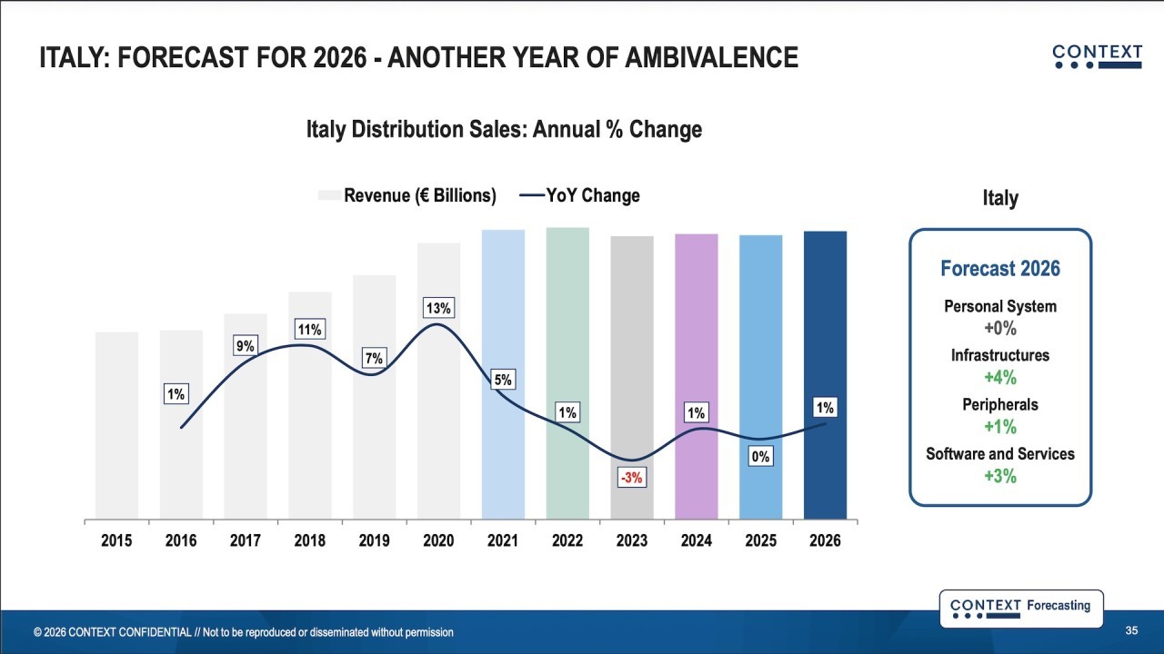 Questo si è riflesso nell’andamento delle vendite tramite la distribuzione ICT nel 2025, che mentre mediamente in Europa sono cresciute di un buon 5,2%, in Italia sono calate dello 0,4%.