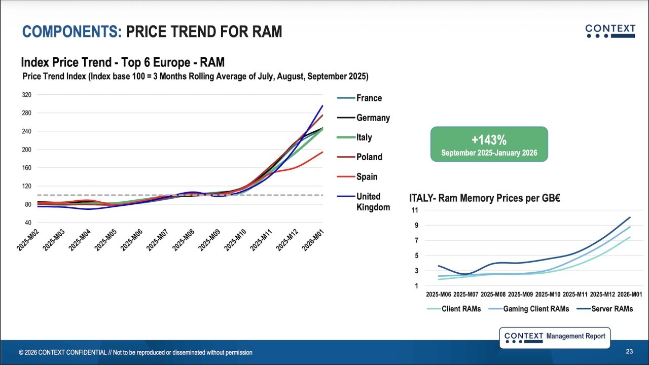 “Tra settembre 2025 e gennaio 2026 i prezzi delle memorie RAM in Italia sono aumentate del 143%, lo storage SSD del 57% e gli HDD del 31%. Analizzando invece l’andamento annuo tra gennaio 2025 e gennaio 2026 l’aumento maggiore è delle RAM (circa 130%), seguite da SSD, smartphone e schede grafiche, mentre in calo ci sono solo processori, switch di rete, e notebook di fascia alta (workstation)”.