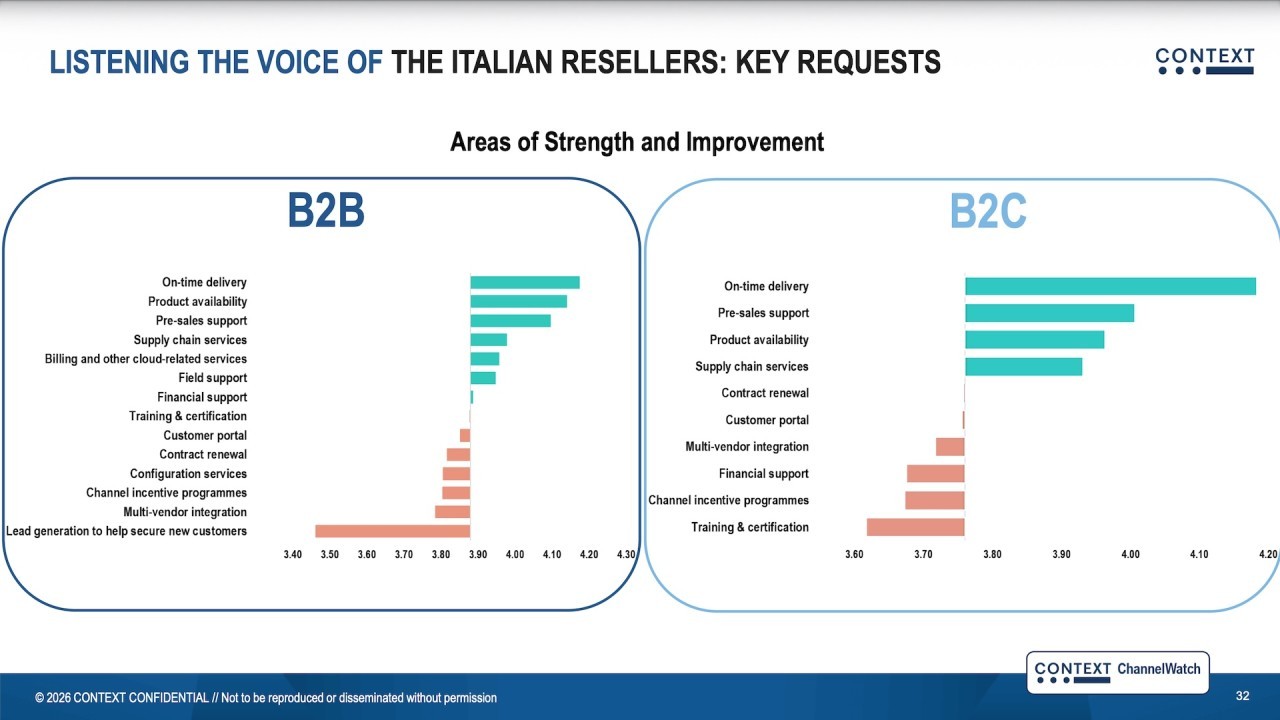 "Ai vendor invece raccomandiamo di ascoltare con attenzione le richieste dei reseller, che sia in area B2B che B2C mettono ai primi posti puntualità delle consegne, disponibilità dei prodotti, supporto pre-sales - in primis generazione lead nuovi clienti -, integrazione multivendor, e programmi di incentivi”, conclude la country manager di Context.