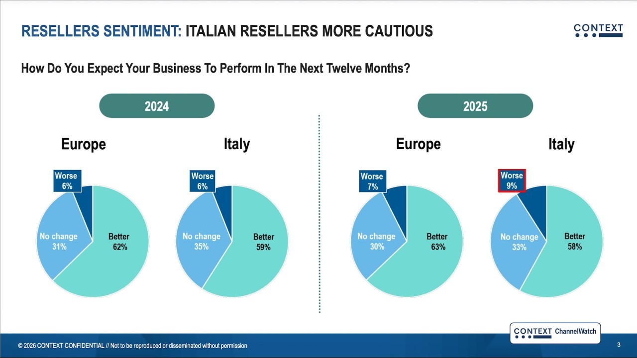“Non per niente secondo le nostre rilevazioni il sentiment dei reseller ICT italiani è più prudente della media europea - sottolinea Aranda -: il 58% prevede un miglioramento del business (la media UE è del 63%), mentre il 9% prevede un peggioramento, contro una media UE del 7%”.