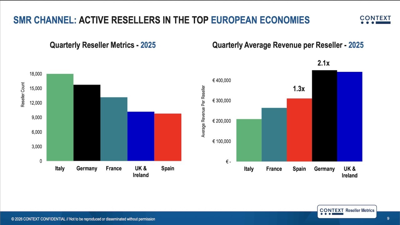 Di questi 20mila active reseller in Italia, il 90% - circa 18mila quindi - sono small e medium reseller (SMR): “È il canale di maggiori dimensioni, rappresenta il 41% delle vendite via distribuzione ICT. Di solito è molto resistente, ma nel 2025 ha avuto difficoltà: anche se l’ultimo trimestre è stato positivo (+2%), l’anno si è chiuso per loro con un calo dell’1,7%, risultato di forti fluttuazioni in tutti i 12 mesi, vendite concentrate negli ultimi giorni in tutti i trimestri, e in generale grande incertezza”, spiega Aranda.