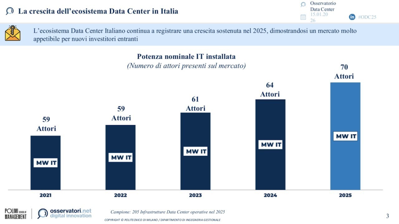 Il mercato italiano dei Data Center sta vivendo una stagione di crescita continua, con investimenti miliardari e ambizioni da protagonista europeo. Tuttavia dietro gli annunci trionfalistici si nasconde una realtà più complessa, fatta di progetti in ritardo, tempi lunghi e imprevedibili per permessi e autorizzazioni, e aspettative spesso disconnesse dalle opportunità reali. È il quadro tracciato dall'edizione 2026 dell'Osservatorio Data Center del Politecnico di Milano, secondo cui negli ultimi tre anni l'Italia ha attirato 7,1 miliardi di euro di investimenti destinati alla costruzione e dotazione di queste infrastrutture strategiche.